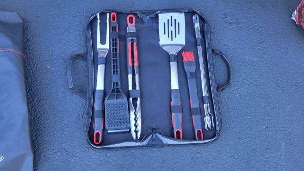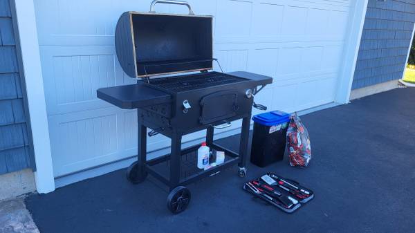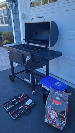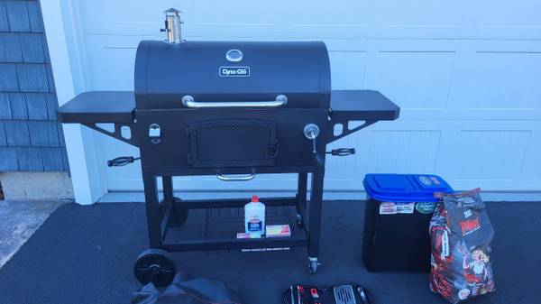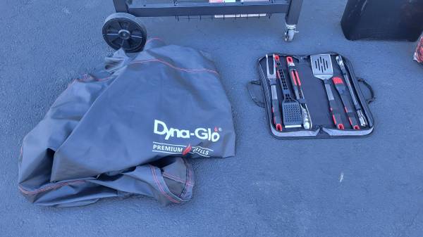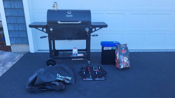 Dyna-Glo Premium Charcoal Grill with heavy duty cover and many extra accessories. Excellent condition. Accessories are: Heavy Duty Grill cover, Charcoal Briquets Kaddy (Container full of briquets), Brand new Expert grill kit (grilling tools), Lighter fluid and matches as shown. GREAT DEAL.....