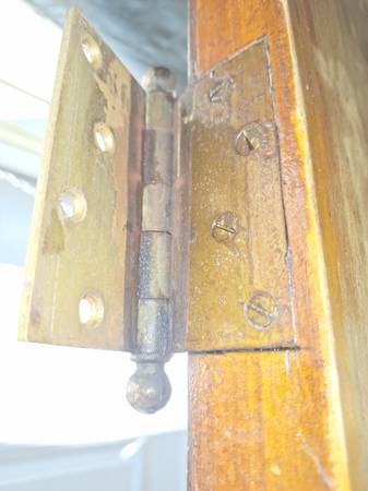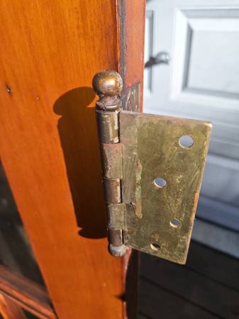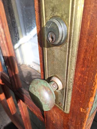 nice thick wood to cut down to size, comes with 2 not matching Brass door knobs, and 3 Full brass hinges, and Brass curtain Hardware rods top and bottom, all the glass is good no chips no cracks. The door has some nicks and scuffs and the one side is a little faded, also has a deadbolt with No key. (look at the pics)