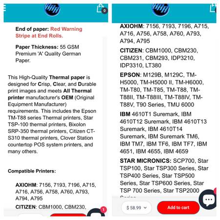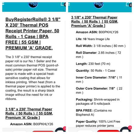 (45) 3 1/8 x 230 Premium A Grade POS Thermal Receipt Printer Paper BPA Free. 2 rolls $1. (55 GSM Premium Quality German Paper)