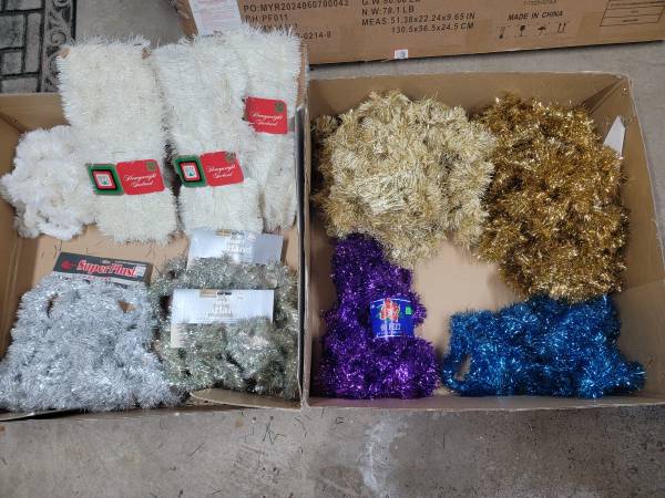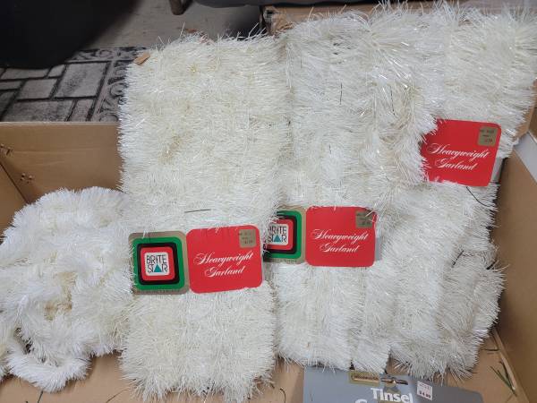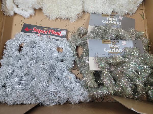 Christmas Tinsel Garland Assorted Colors- 4) White, 3) Silver, 2) Gold, 1) Purple 1) Blue New and used Green lit Garland 6 Ten foot long strips with lights 5 Ten Inch lighted Candy Canes