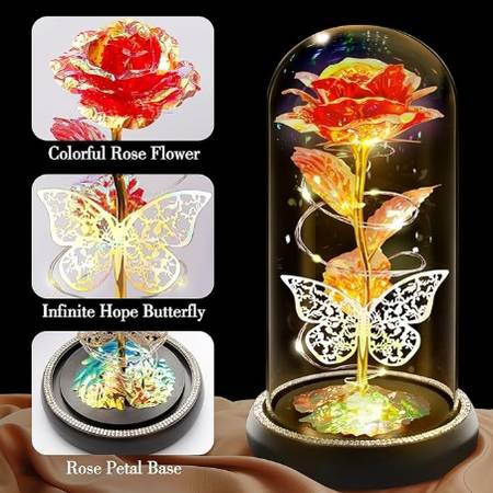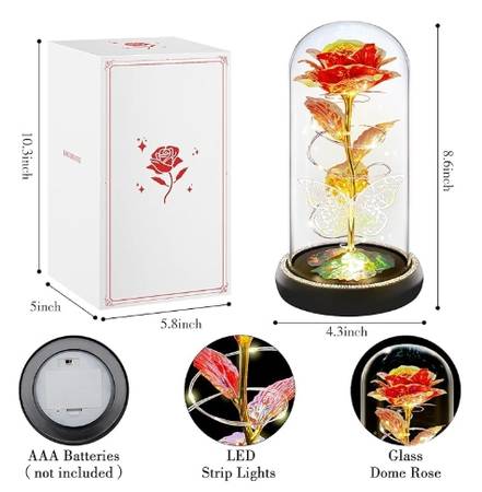 The forever rose that never fades represents eternal love. Inside the clear glass dome is one enchanted everlasting glass red rose, infinite hope butterfly and LED lights. 8.6 inches tall.