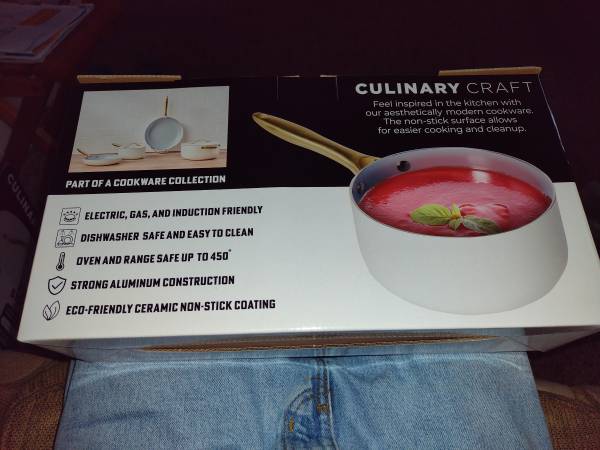 Feature an eco-friendly ceramic non stick coating...creme & gold edition... modern style everyday cookware... Call terry, leave message $10 firm