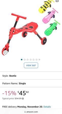 RIDE ON TOY: Adorable tricycle featuring a smiley bug face and butterfly wings in white. A bit more advanced, this is a steerable ride-on with directional wheels for greater maneuverability.