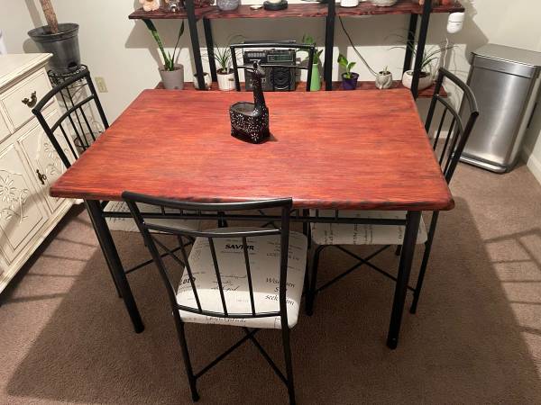 Chairs refurbished with Bible verses. Table and chairs In excellent condition. Tables measurements 46”long,33”Wide and 30”High. If post is up, then is available. Cash only. Prefer text