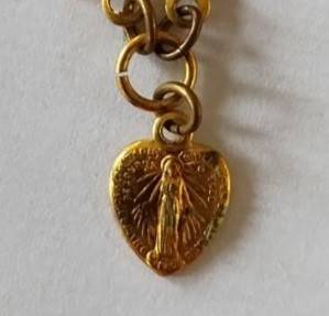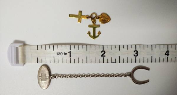 Goldtone charm with cross, anchor, and heart with religious figure. Finish is wearing off all 3 pieces