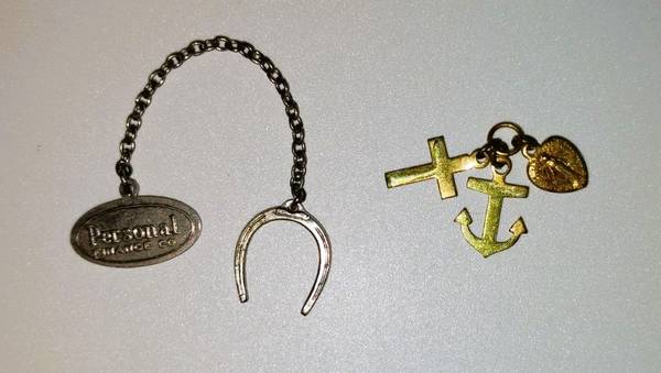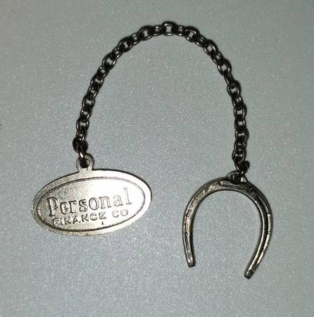 Horseshoe with attached advertising pendant which says "Personal Finance Co"