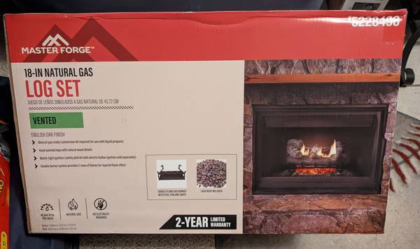 Master Forge 18" 45k BTU Natural gas Dual-Burner Vented Gas Fireplace Logs New in original, unopened packaging English Oak Finish All items are sold as is, cash only, no delivery, returns nor...