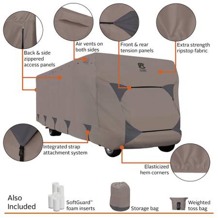 - Strapping and Toss Bag System makes it so you don't have to crawl under the RV to install the cover;