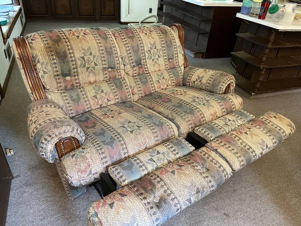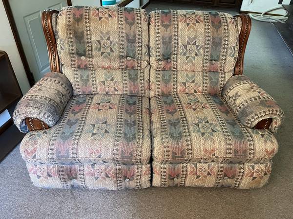 We have for sale this matching set of a couch and loveseat. They are light Pink and Blue. The couch has a button on both ends to push out the foot rests. It is 88" long x 39" wide by 37" high. The loveseat is able to rock on both sides as well both sides have a button to push out the foot rests. It is 65" long x 39" wide x 37" high. Both the couch and loveseat are in great condition and are very comfortable. The pictures don't really do the coloring justice.
