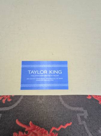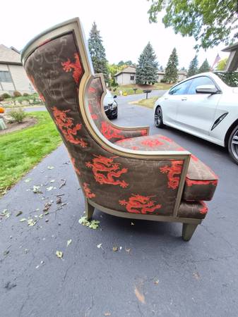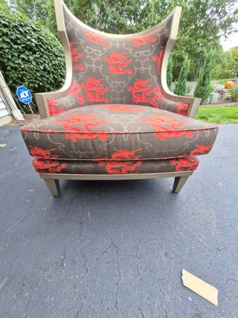 (2) $650 each, David Senise crafted in the USA Taylor King custom made Dover side chairs. Greyish brown fabric with red/orange dragons and brush nickel frame. Purchased new for $2500 each. Chairs...