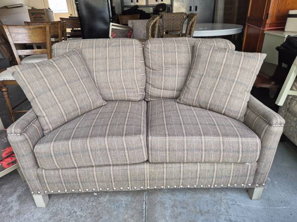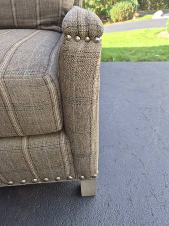 Custom made Masterfield Furniture Company brownish gray plaid loveseat and side chair with nail head trim and removable zippered cushions. Sofa measures 58w x 34d x 32h Chair measures 31w z 34d x 32h
