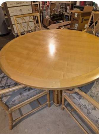Vintage McGuire rattan dining set with 4 chairs. Solid maple table measures 54 inches round. Base is iron and rattan. Chairs measure 22w x 38h (19h to seat)