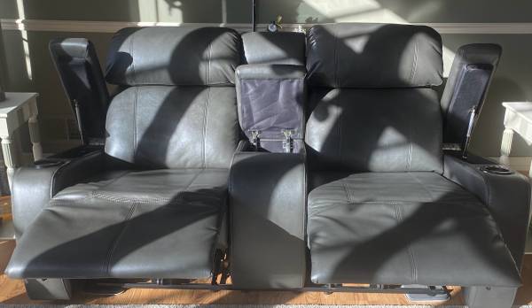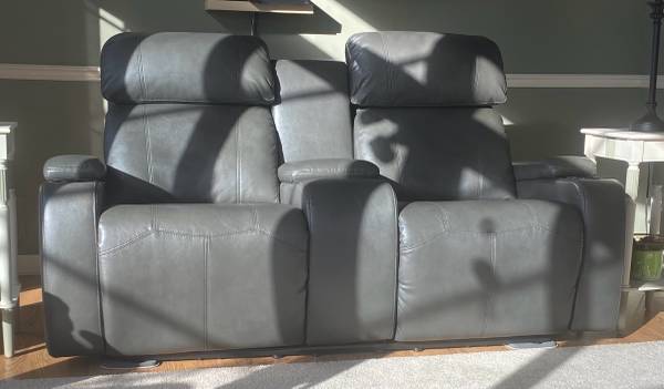 Gray Faux Leather Power Reclining Love Seat. Like new and lightly used in a non smoking home without pets. In our 3 season room that’s not used in the winter. Cash only, thank you.