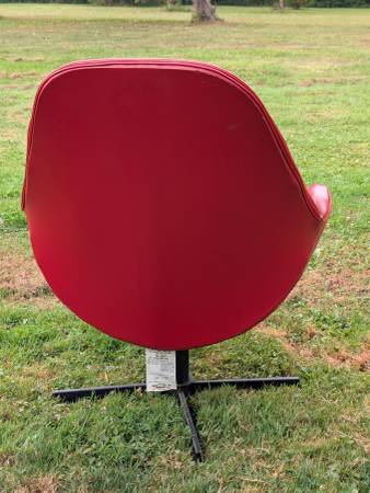 Mid-Century modern swivel lounge chair ,1973 distributed by Frank and sons distributors good condition. Two small nicks on top of chair. Small discoloration on right arm of chair. Heavy steel legs...
