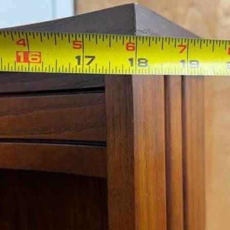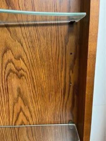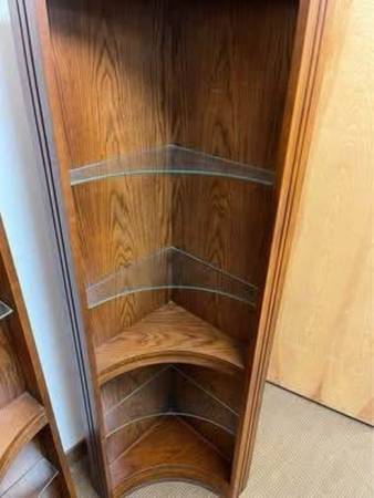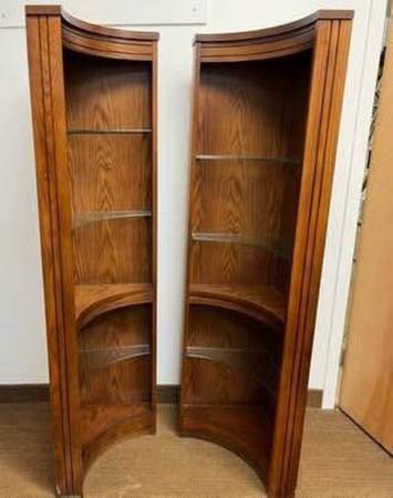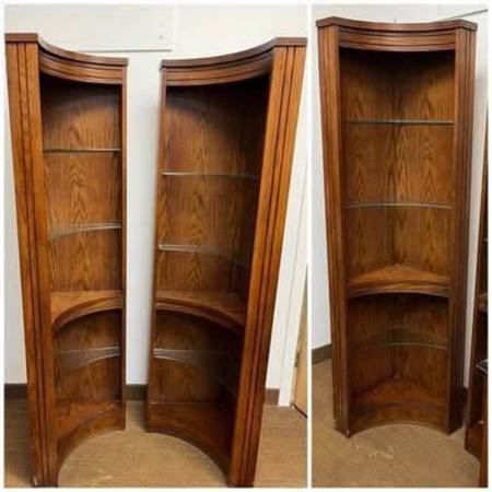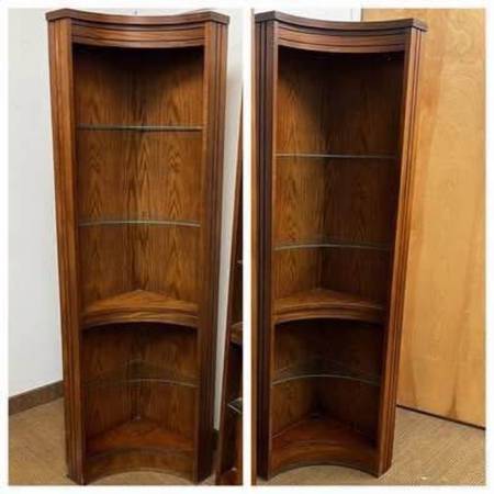 (2) Bassett Corner Bookcase. Corner Bookshelf Pair. Adjustable Glass Shelves. $60ea.