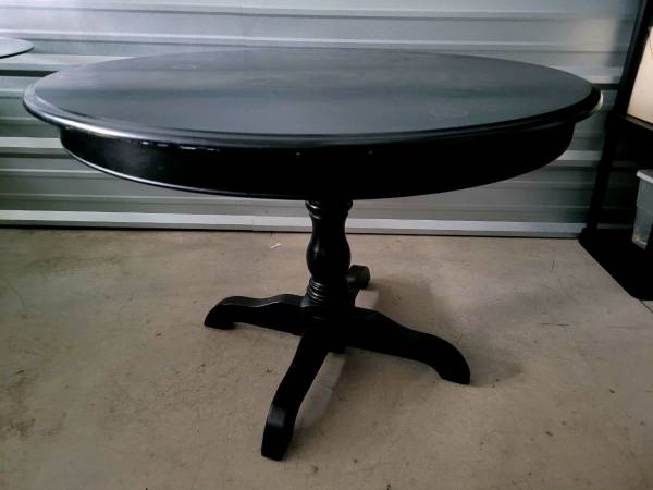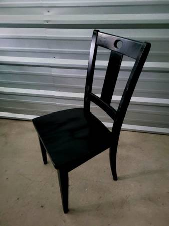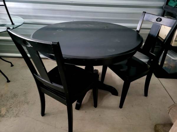 Black wooden dining table. 2 matching chairs included. Cash and carry. Delivery available for an additional fee.