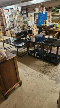 BLACK TEMPERED GLASS COFFEE TABLE and 2 MATCHING END TABLES -$150.00- SEE FRIDAYS 11AM-4PM INSIDE ST. VINCENT DE PAUL TREASURE TROVE 869 N. CLINTON AVE ROCHESTER,N.Y. 14605.WE ACCEPT CASH OR CHECK ONLY- note: lamps in picture have been sold.-- ST. VINCENT DE PAUL IS AN ALL- VOLUNTEER, CHARITABLE ORGANIZATION. WHEN YOU BUY FROM ST. VINCENT DE PAUL, THE SALES PROCEEDS PROVIDE BASIC HOUSEHOLD NECESSITIES FOR THE POOR IN THE ROCHESTER,N.Y. AREA. THANKS FOR YOUR SUPPORT. SALE!! WEAR ORANGE OR BLACK and BUY IT FOR 50% OFF. Please bring help with you to carry this purchase out as we seldom have volunteers to help carry out items. Thank you for your understanding.
