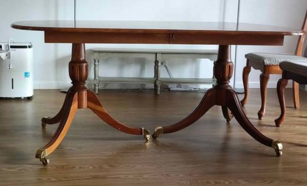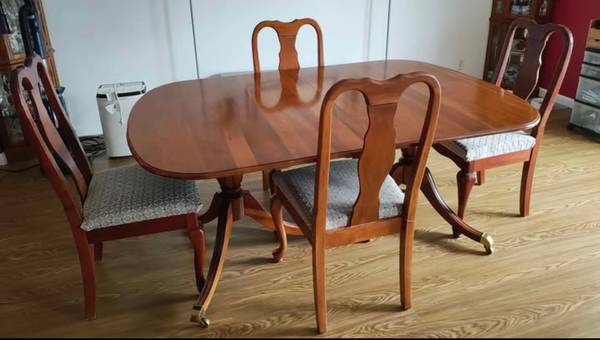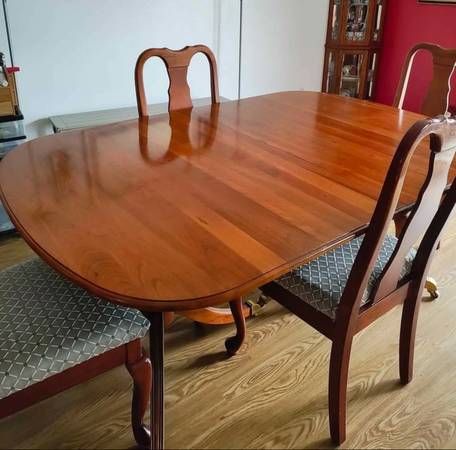 Total of 6 chairs, includes 2 captains chairs, not seen in photos. All 6 chairs fit without leaves. Ready to move, bases have been removed, reattach with enclosed 8 bolts.