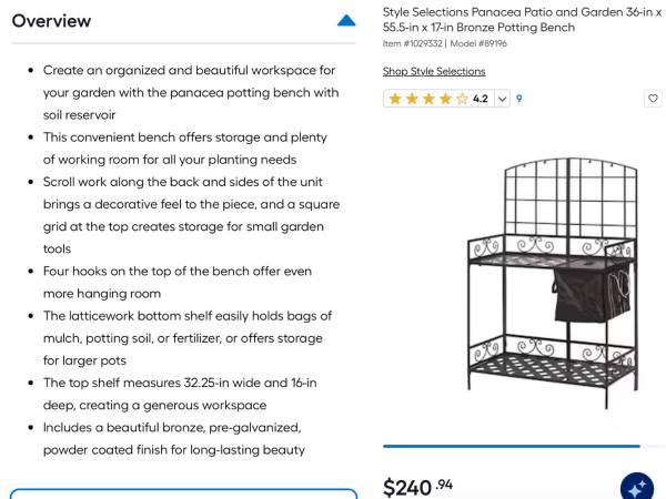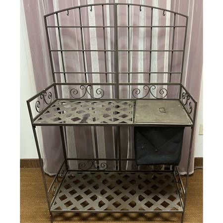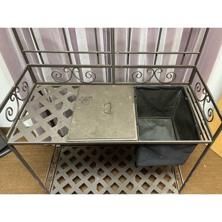 Folding Potting Bench with soil reservoir, hooks, shelves. Outdoor work station. Style Selections Panacea Patio and Garden.