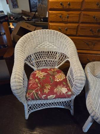 Gorgeous White Wicker Set. 2 chairs with Cushions. Coffee Table and Plant Stand. Excellent Condition. Interested text 478-1049 $120! Pick up East Irondequoit