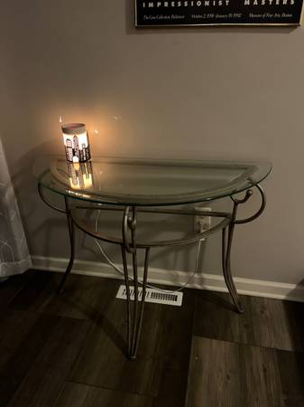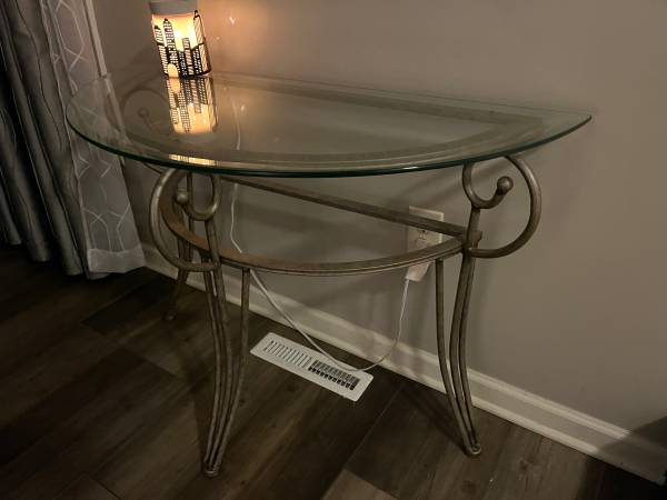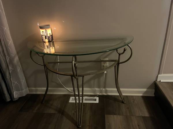 Modern and elegant, this gray metal and glass-top side/sofa table is the perfect accent piece for an entryway, living room, hallway, or behind a sofa. The curved metal frame and thick glass top give it a clean, contemporary look that works with almost any décor.