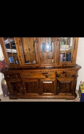 Almost new, very large hutch perfect for displaying china, collectibles, or décor. A few minor scratches, everything works. Solid and impressive statement piece for your home.