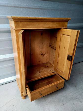 Medium sized wooden cabinet with double doors. Cash and carry. Delivery available for an additional fee.