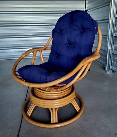 Navy blue cushioned peacock chair with wicker. Cash and carry.