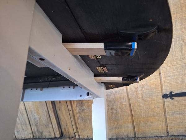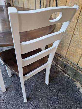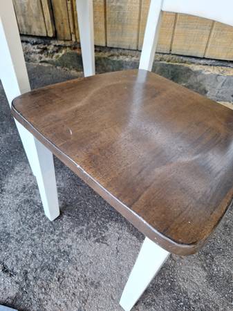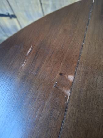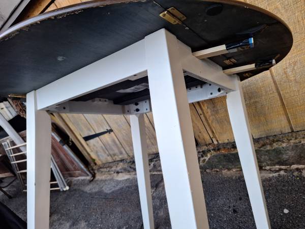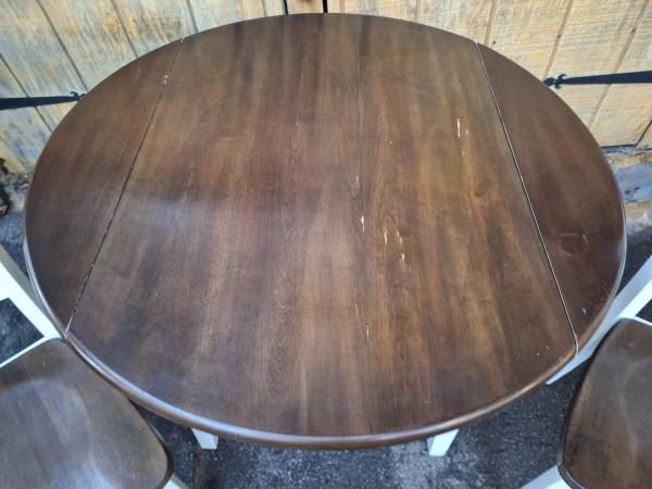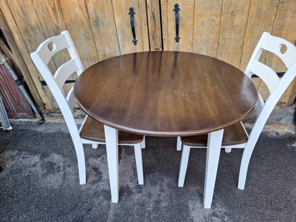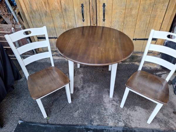 Small wooden table with two wooden chairs table and chairs are very sturdy and tight no cracks the two sides fold down to fit tight against a wall.