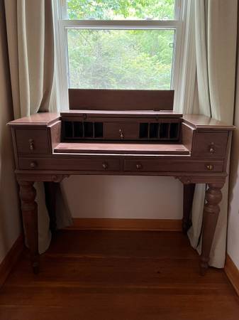 Beautiful hand-made real wood flip top spinet desk with mutliple compartments. One screw on the cover is loose but otherwise in good condition. Pick up only. 41 x 20 x 34 inches