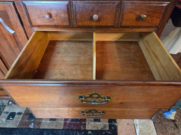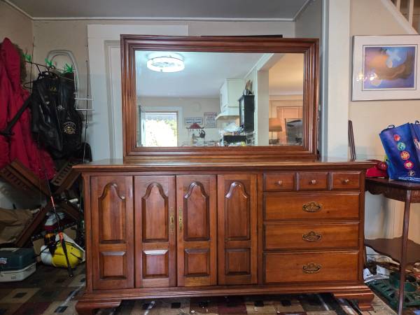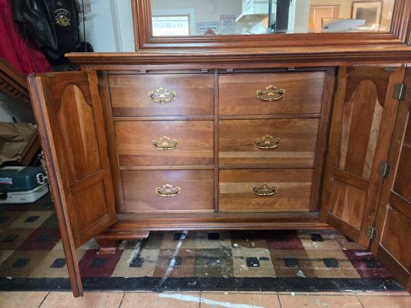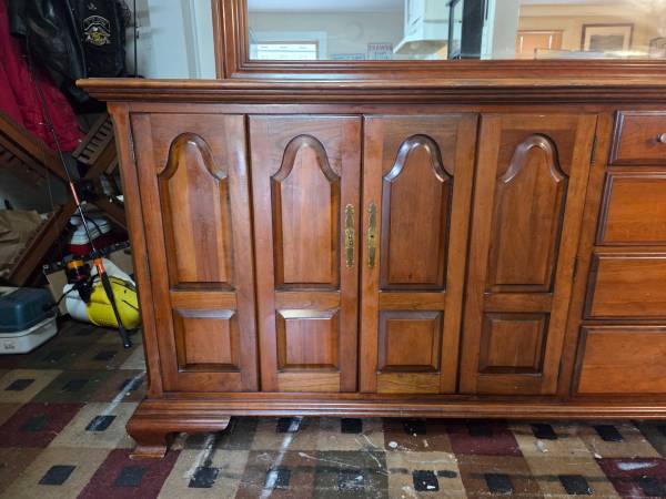 Stunning Solid Cherry 10-Drawer Dresser with Matching Mirror by Thomasville. Dovetail Joints, Smooth Drawers, Gorgeous Crown Molding. Measures 69 x 36 x 21. Mirror measures 56 x 35. Interested text...