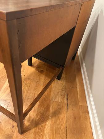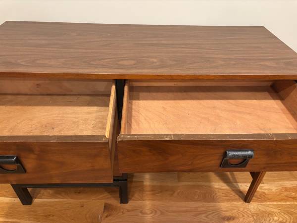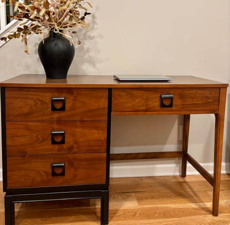 Vintage MidCentury Desk by Dixie. Features 4 large dove tail drawers that all work easily with original black steel knobs.