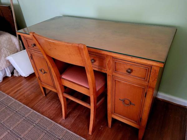 Wooden writing desk with drawers. Matching chair included. Cash and carry only.