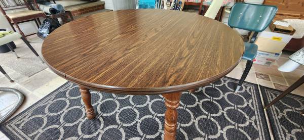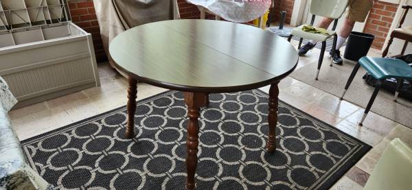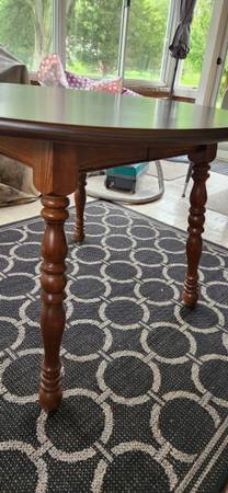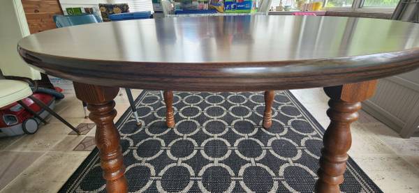Reduced to $130.00 Cochrane Dark Oak Table - 42" Round - 2 - 12" Leaves Extends to 42"x 66" Next to new dining kitchen table Smallest size is 42" x42" Round Largest is 42" x 66" with 2 - 12" leaves...