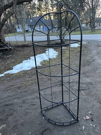 Corner Four Shelf metal and glass Storage H 63”x58”x25” Have glass for shelves but not pictured Excellent condition Pet free smoke free home