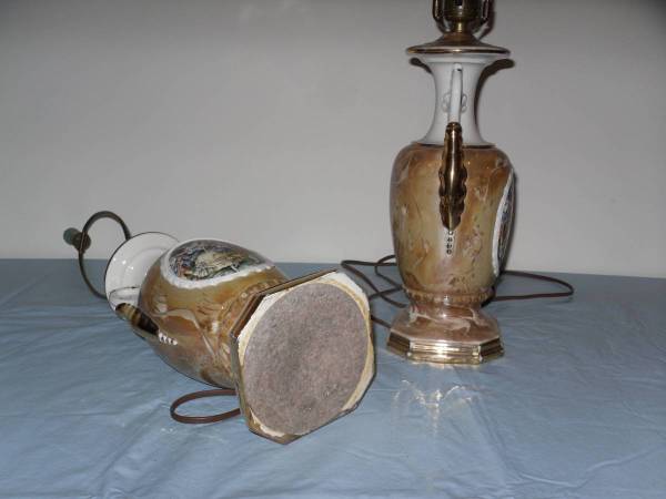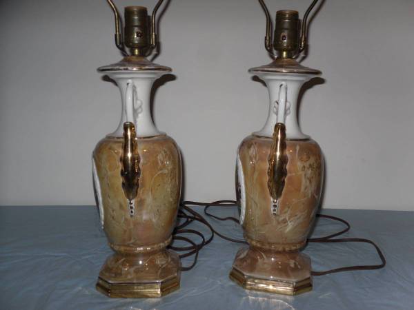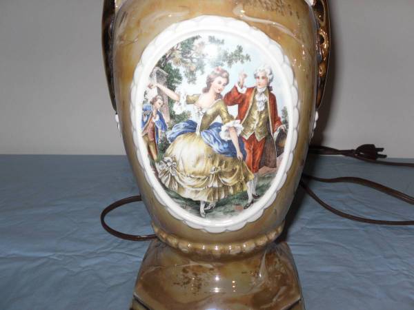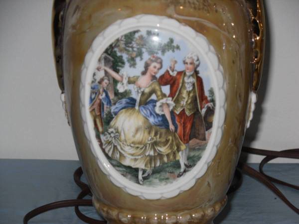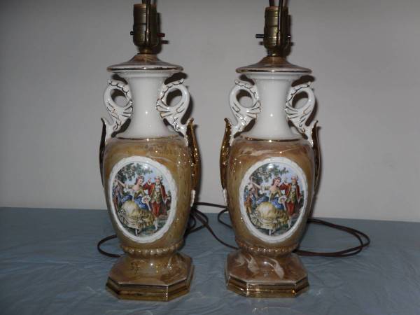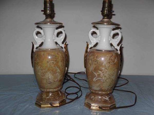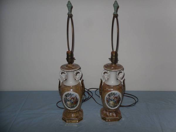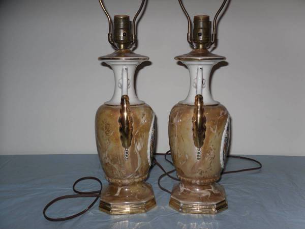 Porcelain Urn Style Victorian table lamps w/rare "Dancing Theme" design. Highlighted w/gold gilt. Berger brass shade holder. 25 1/2" Tall to top of final. Please call . If posted its available.