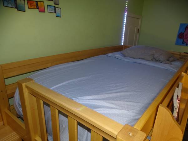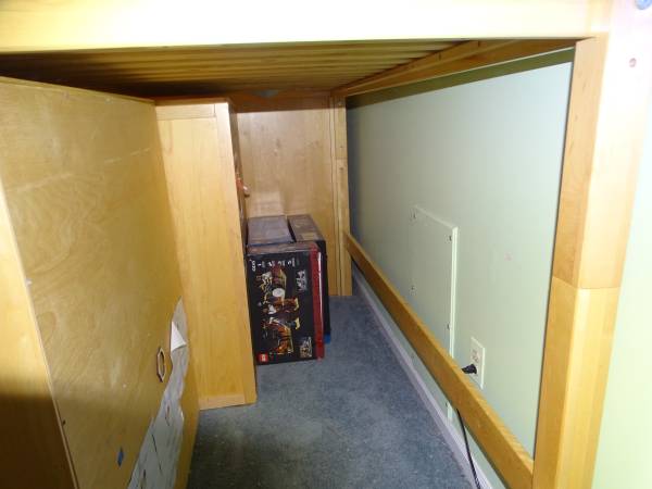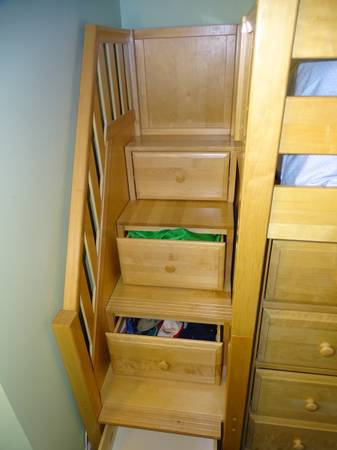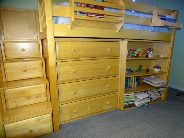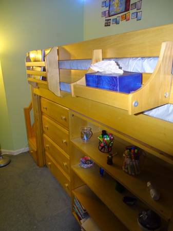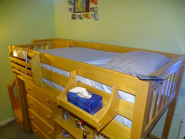 We are selling our sons Matrix Bedroom set. He finally outgrew it. This comes with a loft bed (can be lowered to the ground). Stairs/storage, 4 draw chest of draws, 4 Shelf Bookcase, Book/magazine rack, Hanging shelf, and mattress if you want it. The whole set is in very good condition. The dresser and bookcase can be moved anywhere and the underside of the bed can be a study/play area. Great set for a small room. Lots of storage. We paid over $4000. We are selling for $1800. If you were to buy this new all if it would cost almost $5000. You can look it up at www.matrixkids.com Ask questions