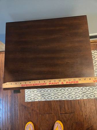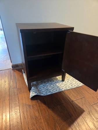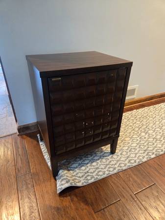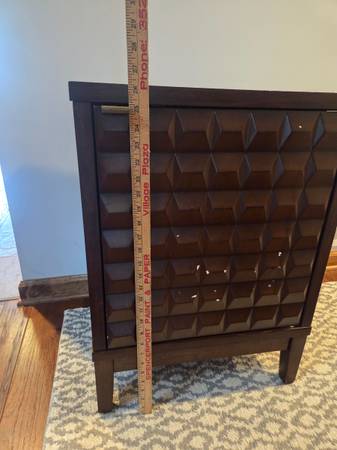 Small end table. night stand , or cabinet. Some dings on the front door but, sturdy and level. Top is scratch free. 26" high 19" wide 16 " deep
