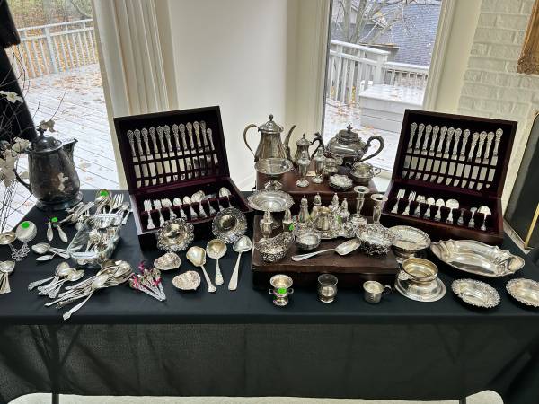 A plethora of sterling silver: flatware sets, tea service, bowls, platters, salt and peppers and more