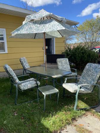 The ticket price is $60 but it’s 1/2 price day so today the whole thing is $30!! Come buy it and check out our yard sale till 6 today. Tomorrow 9-2. Sale is this Glass Table. It's rectangular in shape and has a hole in the middle for an umbrella. It comes with an umbrella and umbrella stand. Along with the table we are selling 4 outdoor chairs with cushions and a large bin for storing the cushions when not in use. The table does show some signs of wear as in a few rust spots but not a lot. It is 66 1/2" long x 38" wide x 27" tall. We are selling this whole set for $100 and AS IS described and shown in the pictures. This is a cash ONLY, no returns, no refund sale. Contact me by if you would like to come see it in person.