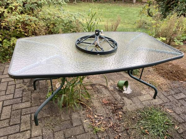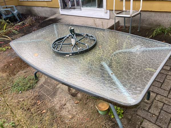 For Sale is this Glass Table. It's rectangular in shape and has a hole in the middle for an umbrella. It comes with an umbrella stand but no umbrella. It does show some signs of wear but not a lot. It is 66 1/2" long x 38" wide x 27" tall. We are selling it for $50 and AS IS described and shown in the pictures. This is a cash ONLY, no returns, no refund sale. Contact me by if you would like to come see it in person.