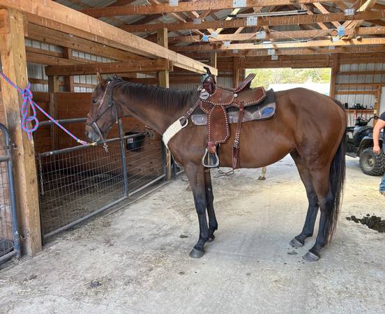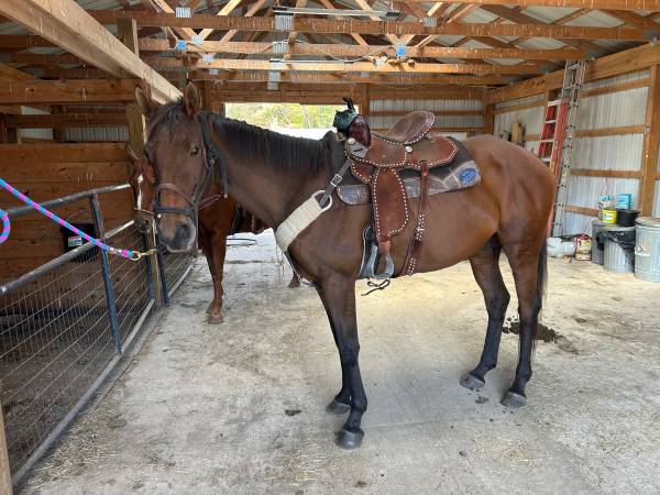 eight-year-old thoroughbred mare16.2 hh Evie is a great trail horse. I think that she would excel in English or even has the speed for barrels. She was used in a lesson program. And she was raised...