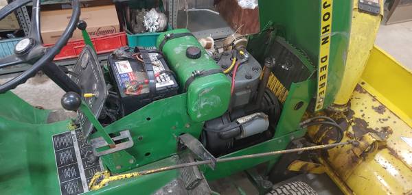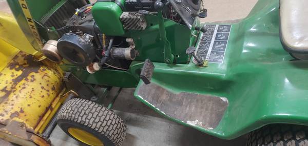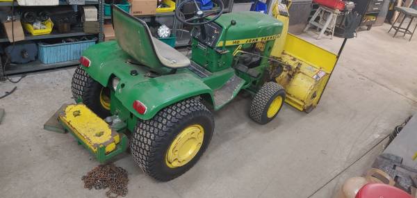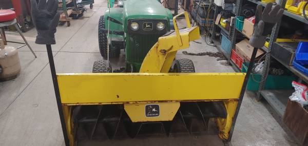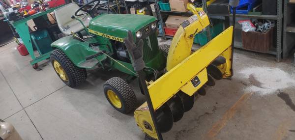 John Deere 140 Garden tractor with snow blower attachment Live Hydraulics work, Rear Wheel Weights, cast iron weight on drawbar Fitted Tire Chains for rear tires, Dual rear brake pedals for tight...