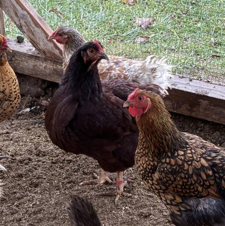 Three laying hens - 1 year old. Laying decent but slowing down as the day gets short. Brown eggs.