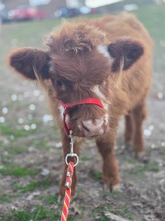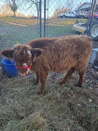 5 mos. old baby Highlander calf. He is sweet, calm and starting to lead nicely. His Moma is not a mini but a smaller Highland/Hereford and his Daddy was a short red nice quality Highland bull. This little guy is going to make some little cow lover a WONDERFUL Chrtmas