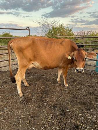 Jersey milk cow named Jenny. 5 years old and happy to be hand milked by children. Being bred next week to an A2 bull (sexed female semen). We got her as a calf from an organic dairy farmer and she has been treated like a pet since day 1. She calved with ease in May and gives 4 + gallons a day with lots of cream on top. She is sweet, gentle and obedient. She has been a fantastic family milk cow. She is Friendly and comes to grain. She was hand-raised so thinks humans are her friends. Very healthy.