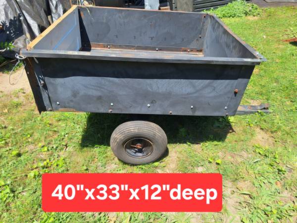10-cu ft Steel Yard Cart· reinforced corners with angle iron, tows and dumps up to 10 cubic-ft of materials, pull leaver release tips bed for easy unloading, Universal pin style hitch, tires hold air.