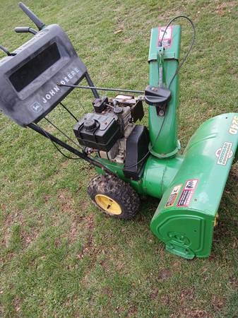 John Deere self propelled snowblower with Electric Start-everything works good. Runs like a swiss watch. 5 forward speeds and 2 reverse. New Carburetor Can deliver