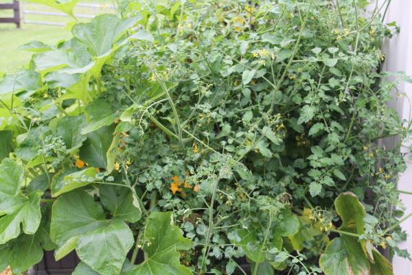 July 2025 with no rain for the month (and never watered), are three 4' x 4' x 2' high raised beds. The two right beds of tomatoes just reseeded from last year. The squash was planted as a see and now moving into the tomato bed and upwards.