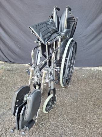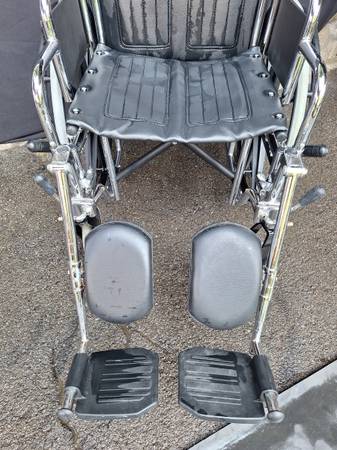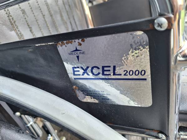 Excel 2000 wheelchair with feet has a hanging bag for storage in the back folds up quick and easy up to 300 lb nice clean shiny, ready to use now.